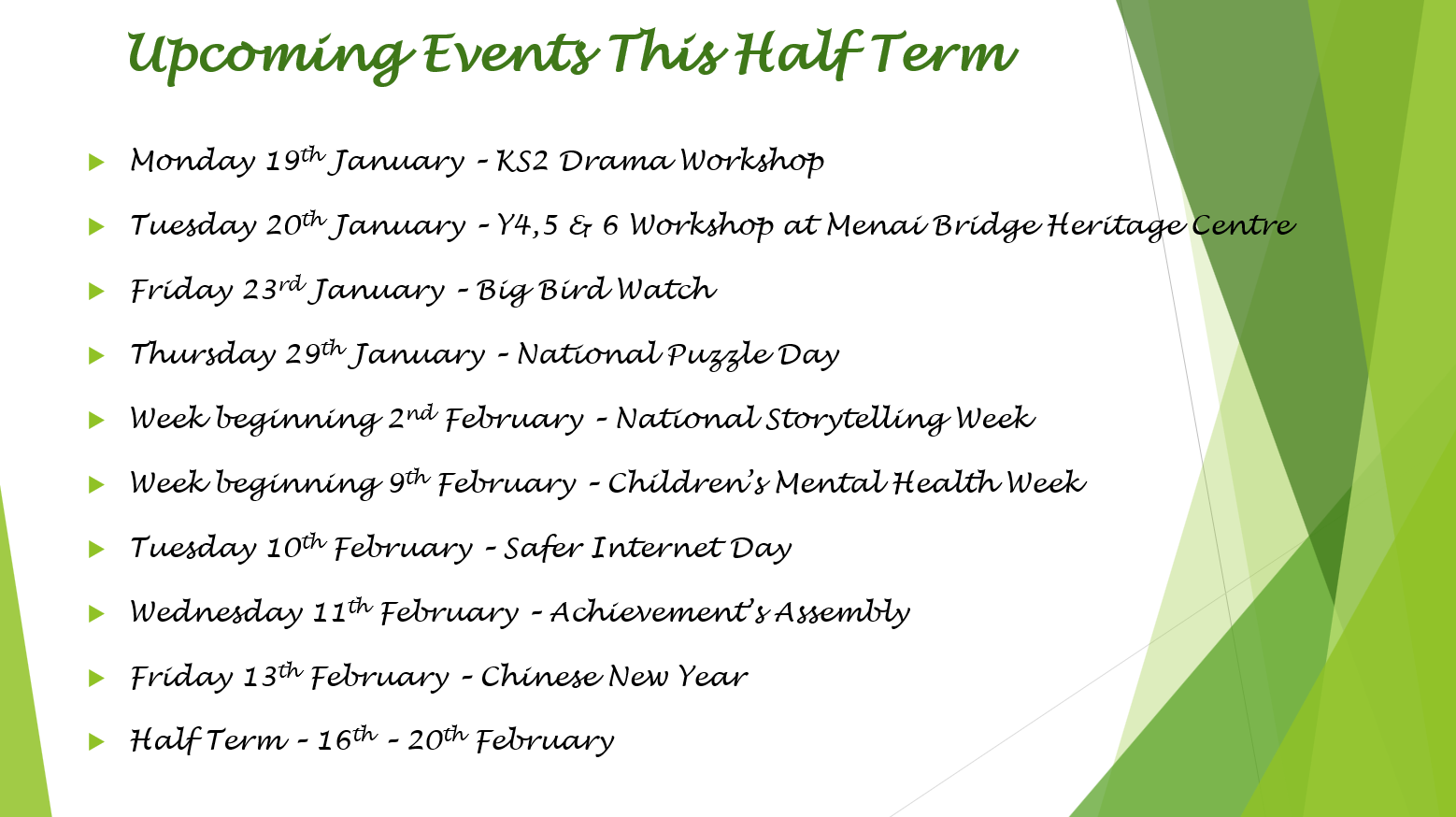 This term the following topics will be our focus in each class, remembering that pupil voice plays a very important role in our school, so there could be some variations to the plans as the term develops.